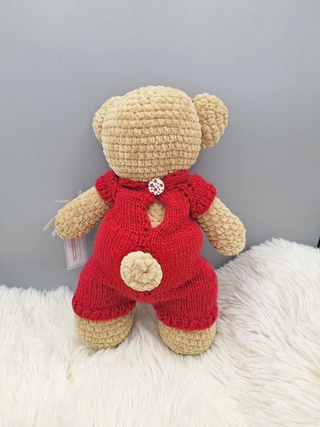 Der Teddy trägt einen handgefertigten Overall aus reiner Baumwolle in einem edlen Dunkelrot.